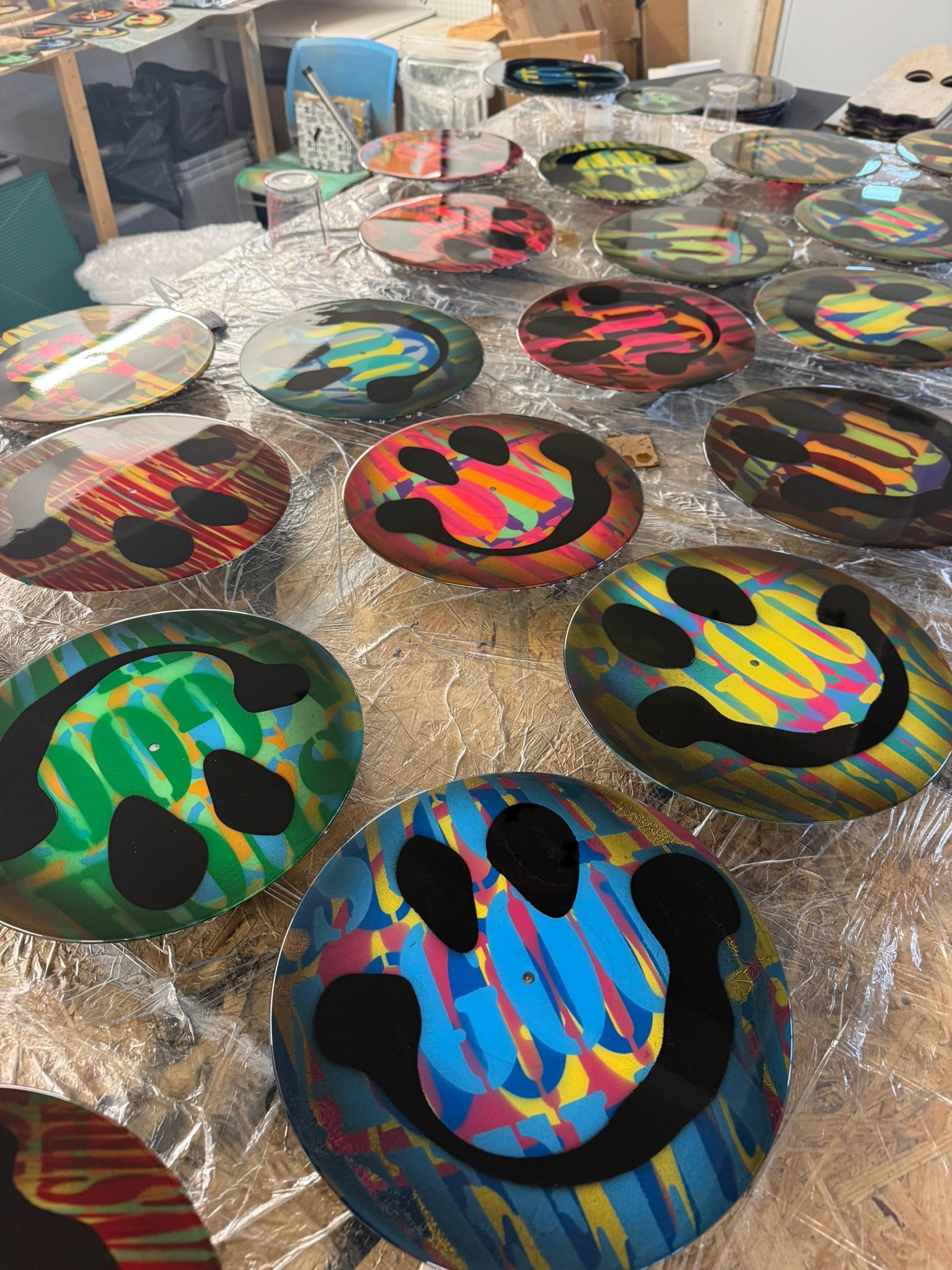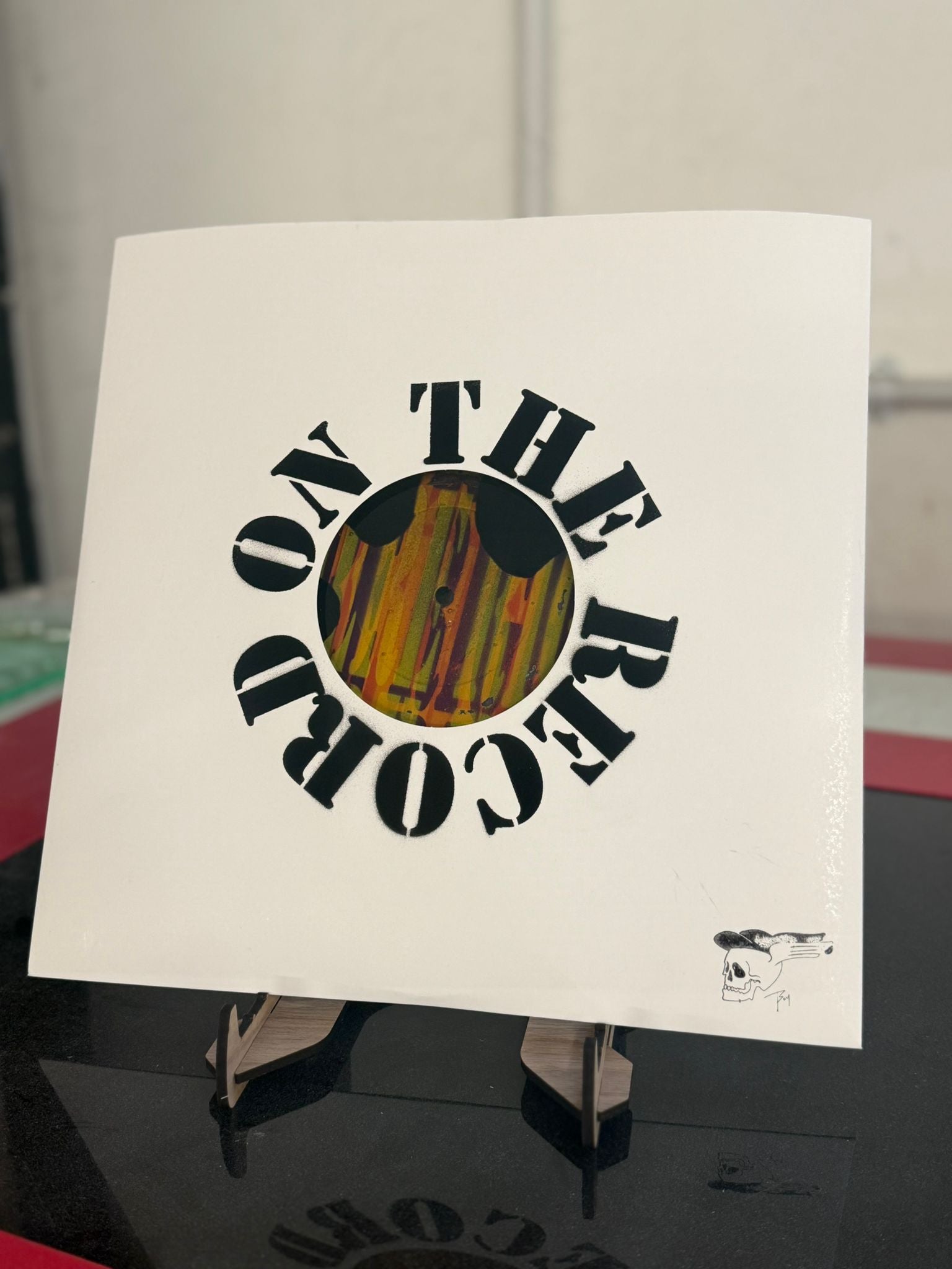 Original 12” albums with multi layered spray can work featuring iconic house lyrics. Layered resin finish to create a glass finish.